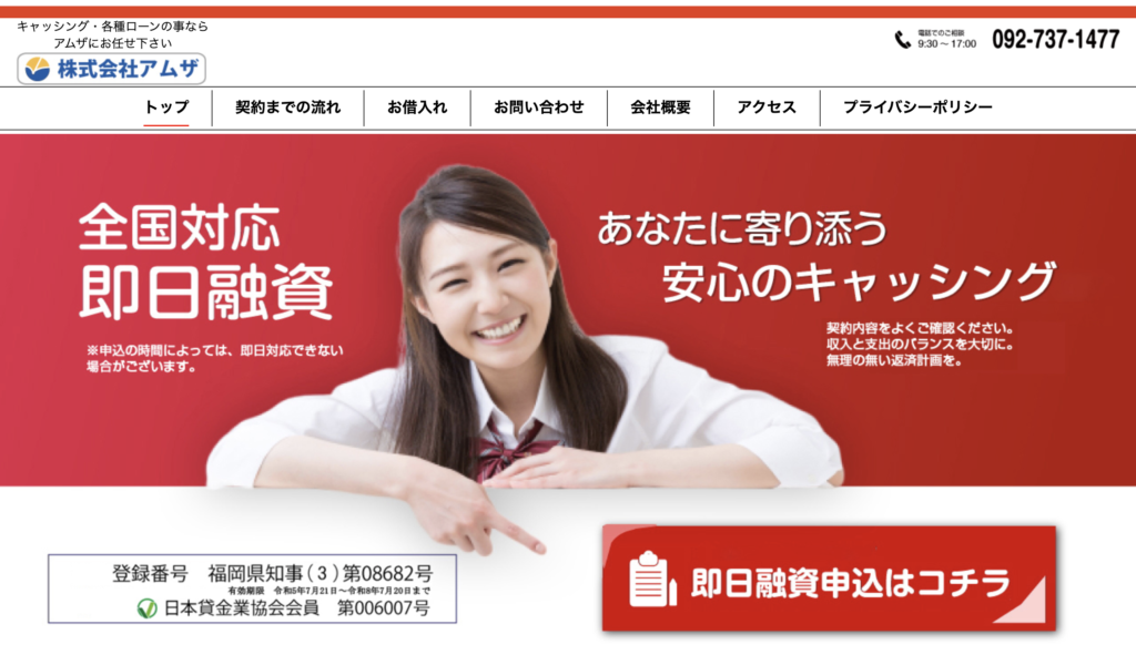 アムザ株式会社は、福岡県に本社を置く正規の消費者金融業者で、福岡県知事(3)第08682号として貸金業法(e-Gov法令検索)に基づく貸金業登録を受けている信頼できる会社です。
