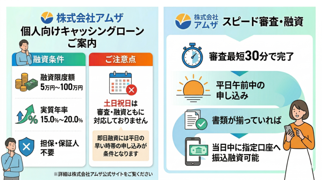 アムザの主力商品は個人向けキャッシングローンで、無担保・無保証人で利用できる融資サービスを提供しています。