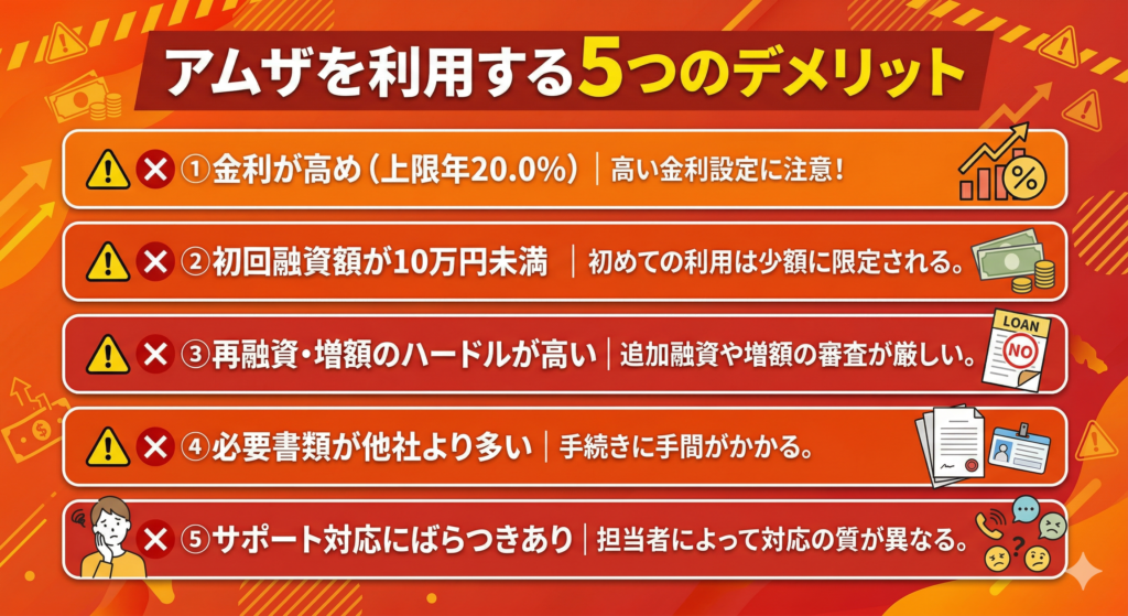アムザの上限金利は年20.0%で、2026年1月から上限金利を年17.9%に引き下げたアコムなど大手消費者金融と比較すると金利負担が大きくなります。